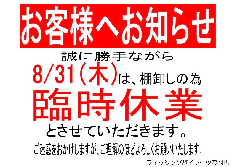 フィッシングパイレーツ豊岡店営業時間変更のお知らせ
