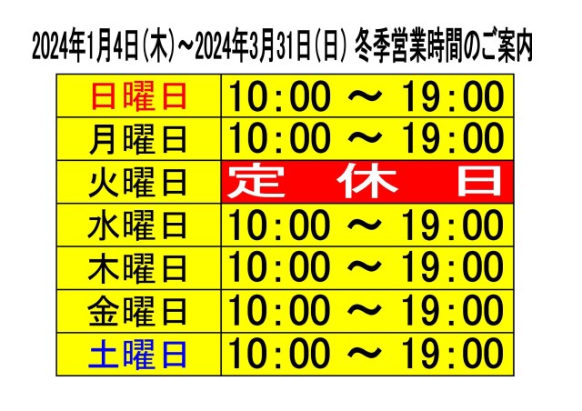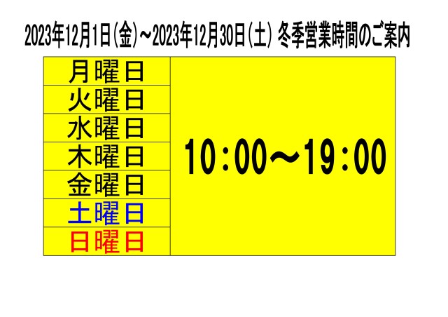 2023年12月1日より冬季営業時間として、営業時間を全日10時~19時に変更させていただきます。