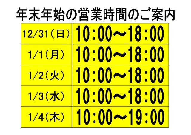 12/31~1/3は、10:00~18:00。1/4以降は、冬季営業時間として10:00~19:00で営業させていただきます。また、1/9より3/31まで火曜日を冬季定休日とさせていただきます。 お客様にはご不便をおかけして申し訳ございませんが、ご理解のほどよろしくお願いいたします。